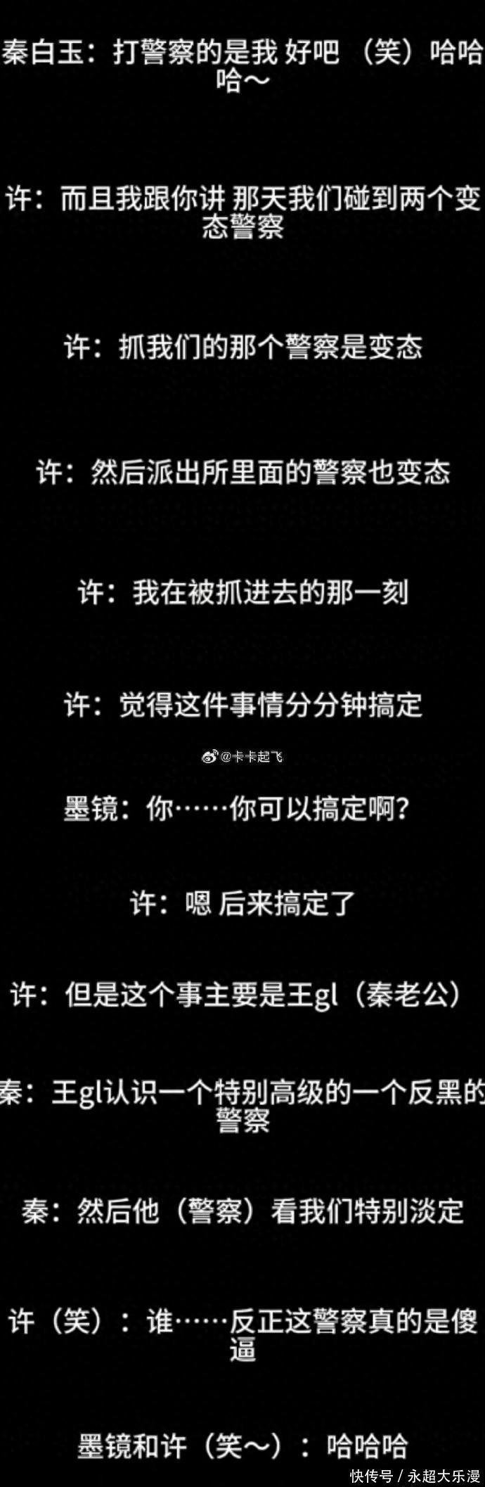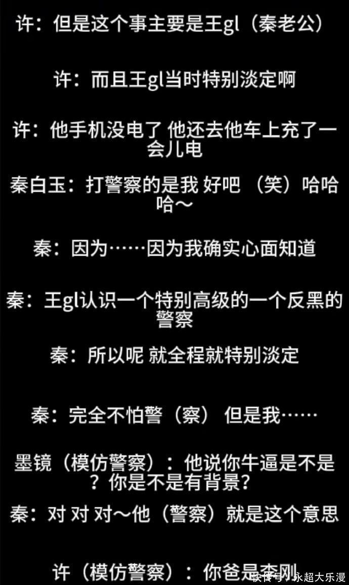 秦雯自曝袭警被抓后,找高级反黑警察捞人,并让王家卫捞人找自己       一个人能狂到什么地步?看看大编剧秦雯就知道了。她抢了新人编剧古二《繁花》的署名,这在圈子里其实不算新鲜事,换平时新人可能就忍了。可偏偏古二得了渐冻症,没什么可顾虑的,直接就鱼死网破,把剧组录音给曝光了。这录音一出来,不光证明古二才是真编剧,还爆出秦雯自己说袭过警,甚至找高级反黑警察捞人的事,这性质可就严重多了!       录音里秦雯把袭警和捞人的细节说得明明白白,还一脸得意,时不时骂警察是变态,那 “猖狂” 劲儿真是没谁了。她还跟王家卫说,要是王家卫被抓了,也能找她捞人,这简直是把法度当摆设啊!而且她还提到了具体的派出所,可直到现在,相关各方都没吭声,真是让人摸不着头脑。       秦雯袭警是 2024 年的事,那天她和同伴许某在上海进贤路,因为拍警察执法起了冲突。秦雯误以为警察打了许某,上去就一拳捶在警察背上,许某也跟着掺和进来动手。警察可没惯着她们,直接用辣椒水制服,把俩人带到了黄浦分局瑞金二路派出所,这时候更离谱的事就来了。       被抓后秦雯一点都不慌,直接找关系。她通过导演丈夫王光利联系上一个 “高级别反黑警察”,没多久就有个 “朋友的小弟” 来派出所,就说两句话,还声称 “联系好所长了”,把她和许某给捞走了。秦雯在录音里还说 “全程特淡定,知道有人能捞我们”,这口气真是够大的。       现在真不知道秦雯还能不能淡定下来,也不知道那个捞人的警察慌不慌。可能有人会说秦雯是在口嗨,可她把过程说得太详细了,而且许某也在录音里,总不能俩人一起口嗨配合得这么好吧?再说秦雯也没第一时间否认,这事儿其实已经很明显了,她就是想拖时间让大家忘了。       可现在是网络时代啊,网络是有记忆的,沉默冷处理根本没用。这事已经闹得众怒了,想不了了之肯定不行,秦雯总得为自己的行为付出代价。要不是她把老实人古二逼急了,古二也不会豁出去曝光录音,这录音一爆,不光秦雯,连王家卫的形象都掉了一大截。       最讽刺的是,上海警方、瑞金二路派出所还有秦雯本人,都一直沉默,连这事是真是假都不回应,这不是更让网友怀疑吗?没个蓝底白字的通报,真说不过去。秦雯这嚣张劲儿,简直无法无天,就算是编进影视剧里都够炸裂的,没想到现实里还真发生了,只能说 “艺术果然来源于生活” 啊!